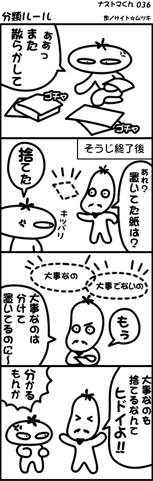 4コマまんが, ナストマくん 【ナストマくん】分類ルール 2009/2/7 土曜日 mutsuki コメントする 本当に、どれが「大事で取っておいてあるもの」 なのか見分けがつかないのだ。 ☆モバイル版のお知らせ モバイル版の更新が滞っております。 サーバーの調子がおかしくて更新データをアップできない状態です。 ケータイでご覧になられてる方にはご迷惑をおかけします。m(_ _)m サーバー移転しなきゃ…くすん