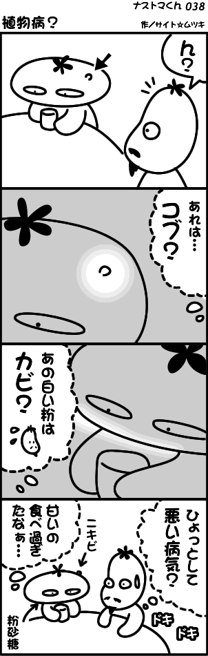 4コマまんが, ナストマくん 【ナストマくん】植物病? 2009/3/9 月曜日 mutsuki コメントする 時々、甘いのを猛烈に食べたくなる衝動に駆られますが 翌日すぐに効果(?)が出てしまいます。