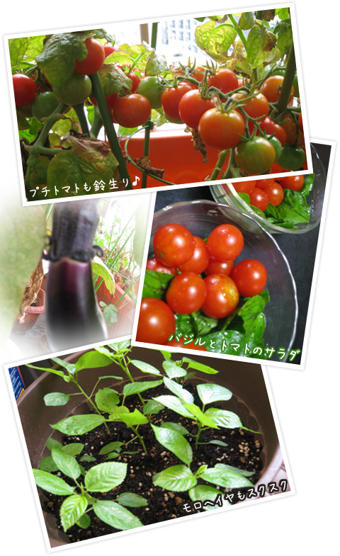 ガーデニング, ナストマくん 【ナストマ便り】緑のカーテンほぼ完成 2009/7/13 月曜日 mutsuki コメントする 西日対策のために植えていたゴーヤ。 いつのまにかベランダの天井まで到達。 朝顔もゴーヤと同じネットに絡まって しのぎを削っているようす。 なかなか色づかなかったプチトマトも こんなに鈴生りに。 バジルも収穫してサラダにした。 弱ってたナスも ようやく第4号が育ってきた。 そろそろ梅雨明け。 じめじめとする中で弱ってた植物も これから元気になってくれるはず。