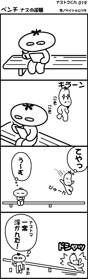 何やらベンチで考え事をしているトマトに復讐を企んでいる模様。